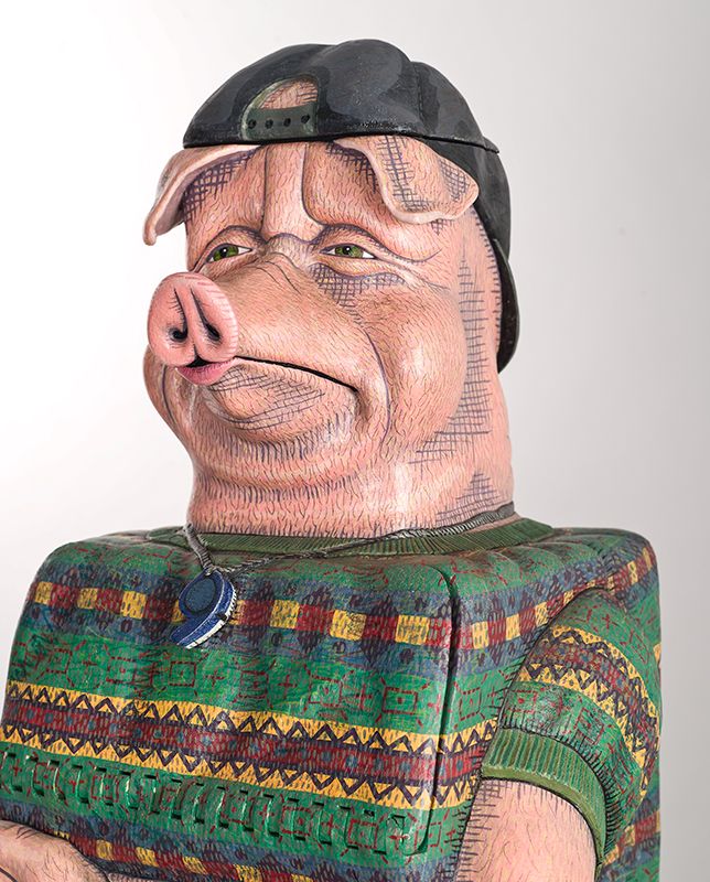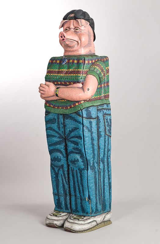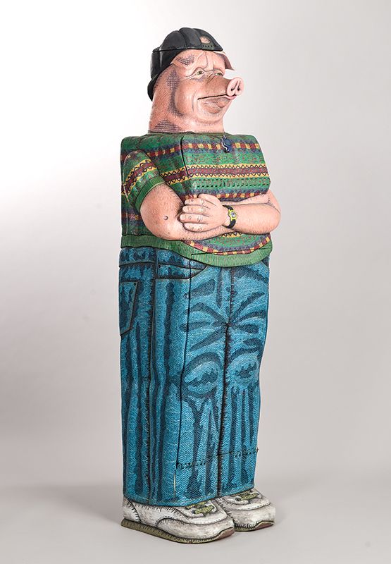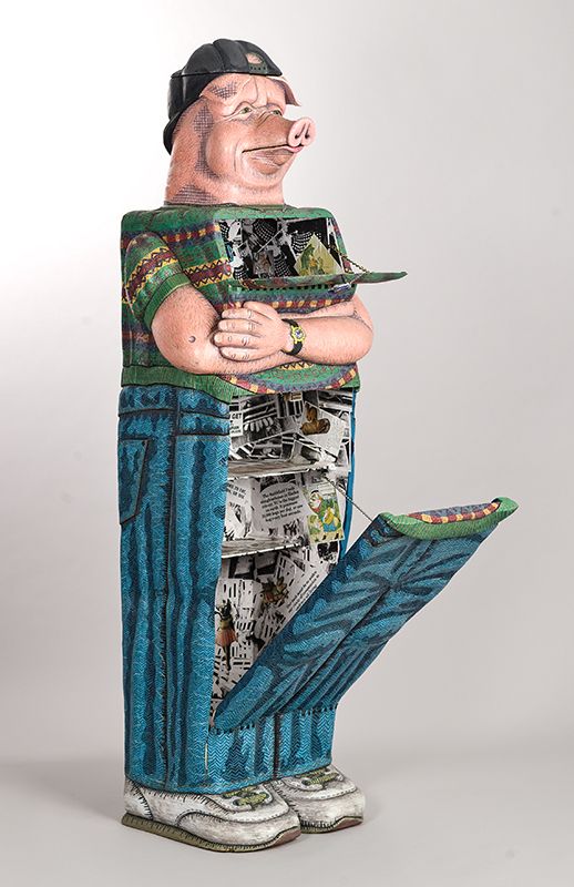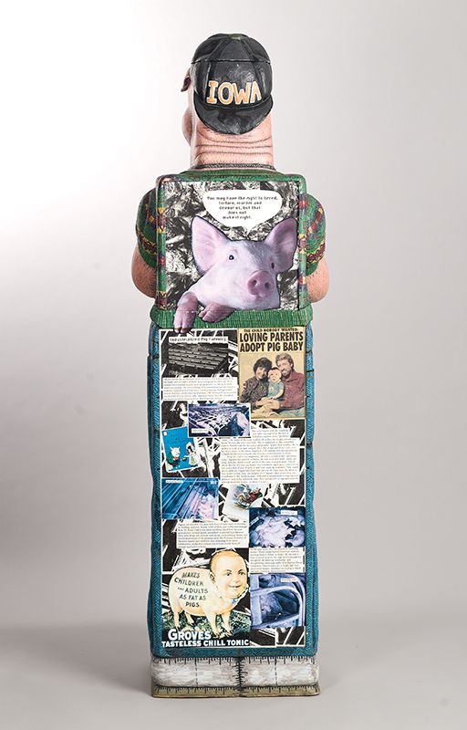 Pigheaded is wearing an Iowa baseball cap, the former pig producing capital of the USA (now North Carolina,) a pig-whistle around his neck, and a Porky Pig watch. His interior spaces present information about pig factory farming, from birth to slaughter.