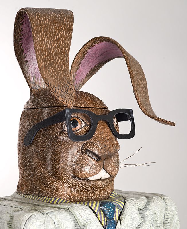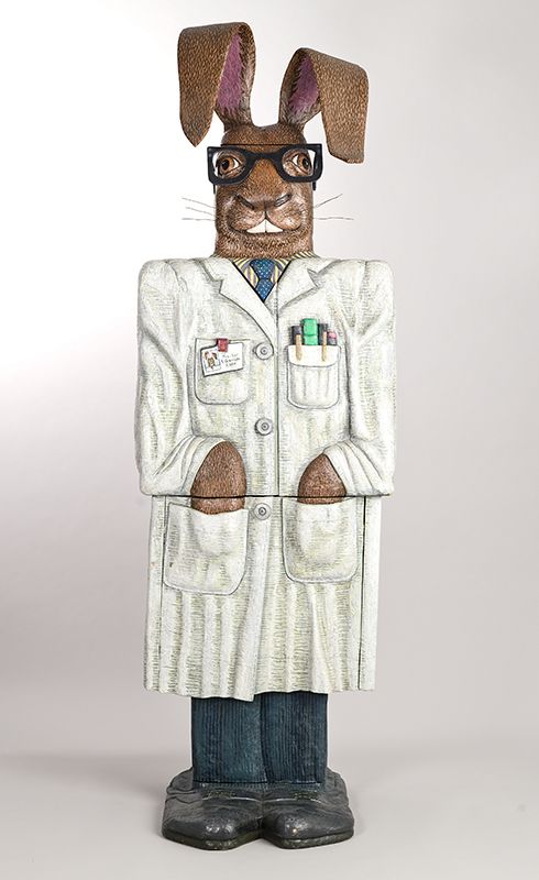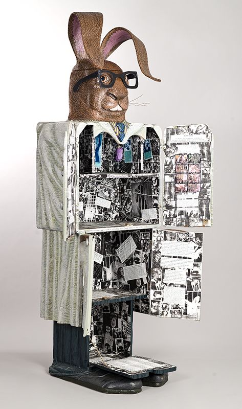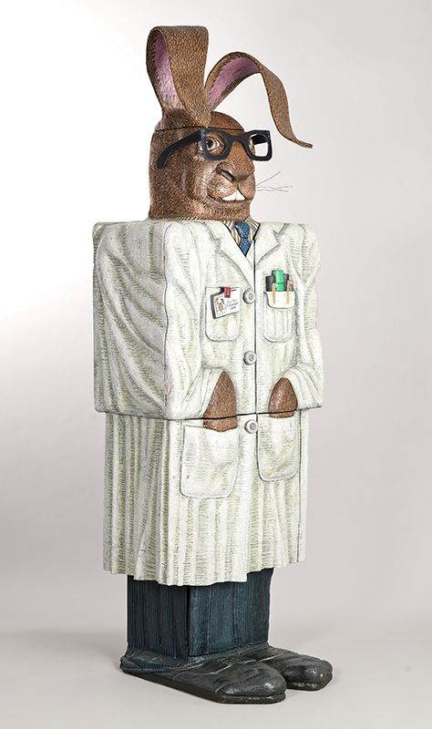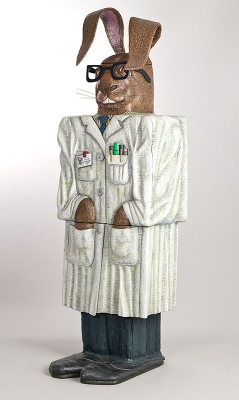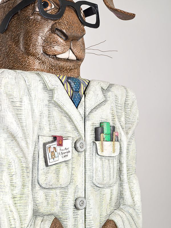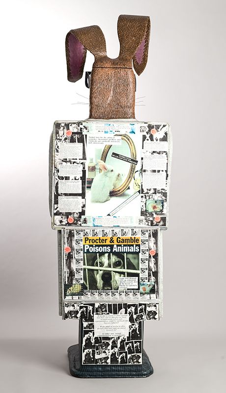 Harebrained is a scientist with his ID badge from Proctor and Gamble (a major animal testing company) and his pocket of pens,ready to come up with some harebrained idea. His interior compartments contain a lucky rabbit’s foot and address vivesection (in particular the Draize Eye Test and the LCD 50 Toxicity Test) and list some antivivesectionists.