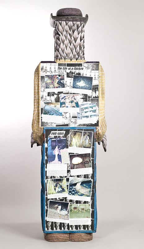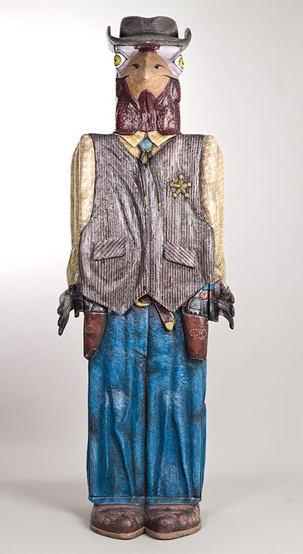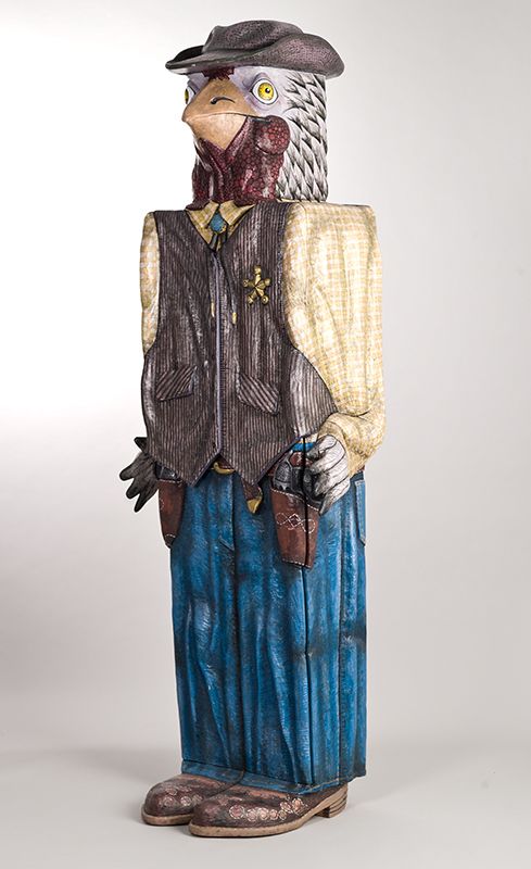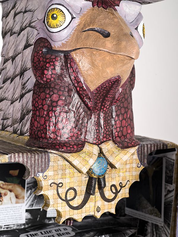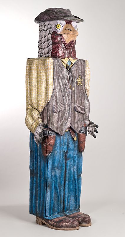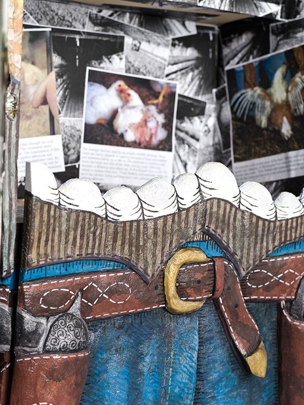 Chickenhearted is a sheriff from out west who's shakin’ in his boots (due to his chicken-hearted nature) as he draws his guns in the defense of fowl. His interior spaces provide information about the life of a chicken, turkey, and duck in the human pursuit for consumption of their flesh, eggs, and down.