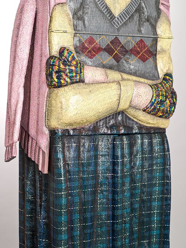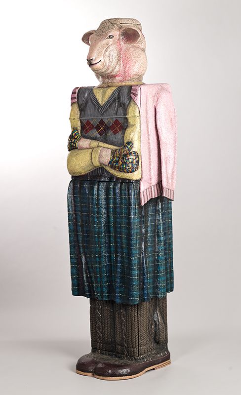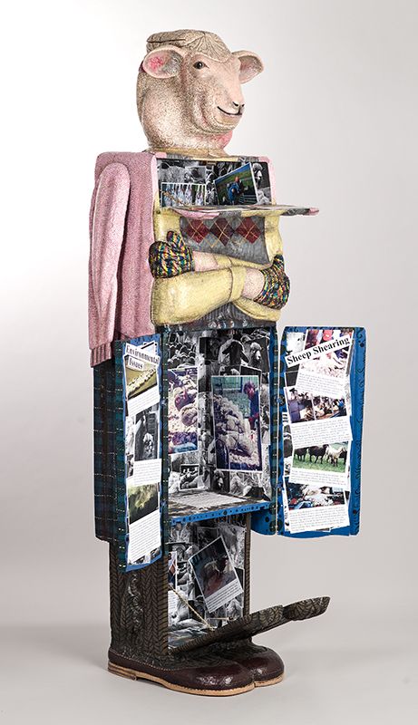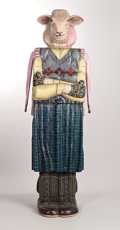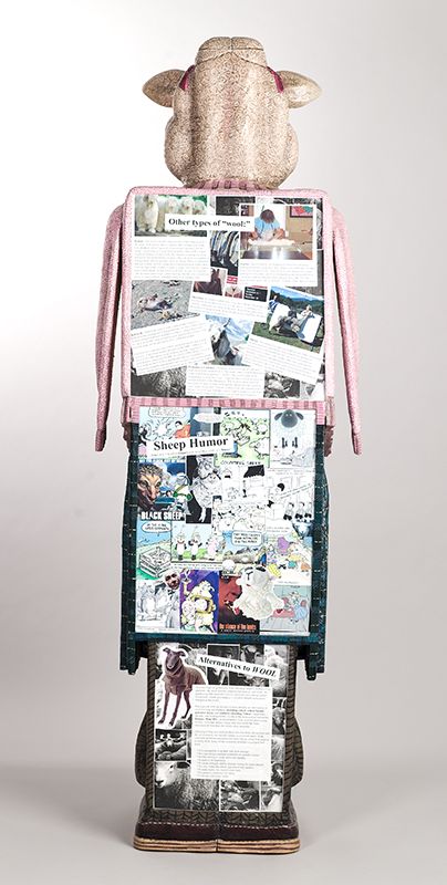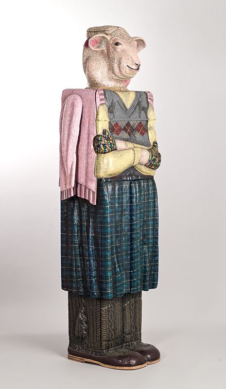 Sheepish is a demure librarian from New England, is bundled up in wool, from her sweater to her skirt to her cable-knit stockings (not to mention her mittens) -- carved from basswood and then intricately finished with acrylic paint and pencil. She’s a bit sheepish to divulge the inside story behind the typical human quest for wool, but her insides present the process which includes muesling and deportation for meat consumption.