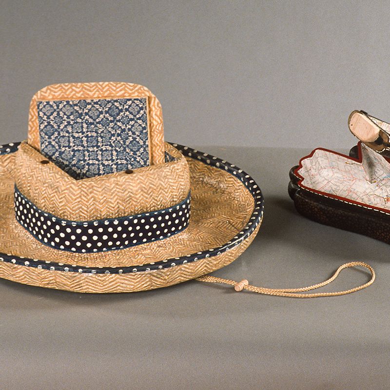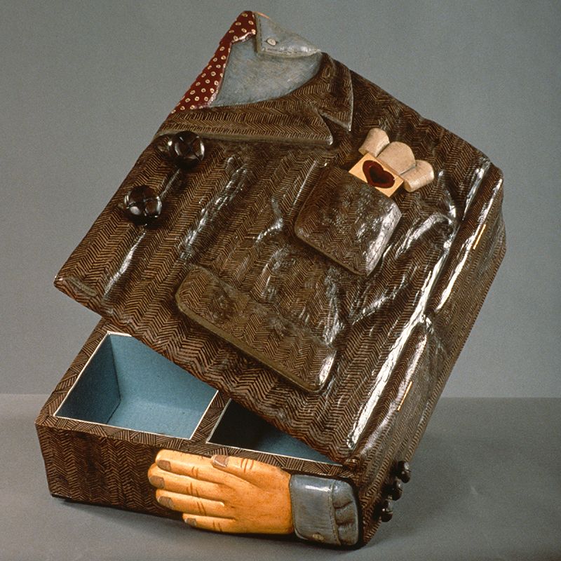 Small carved wooden containers depicting visual puns. For example, “Glove Compartment” is a carved wooden glove that opens to reveal a storage area; or “Briefcase” is a carved pair of men’s briefs in the shape of a briefcase complete with handle.