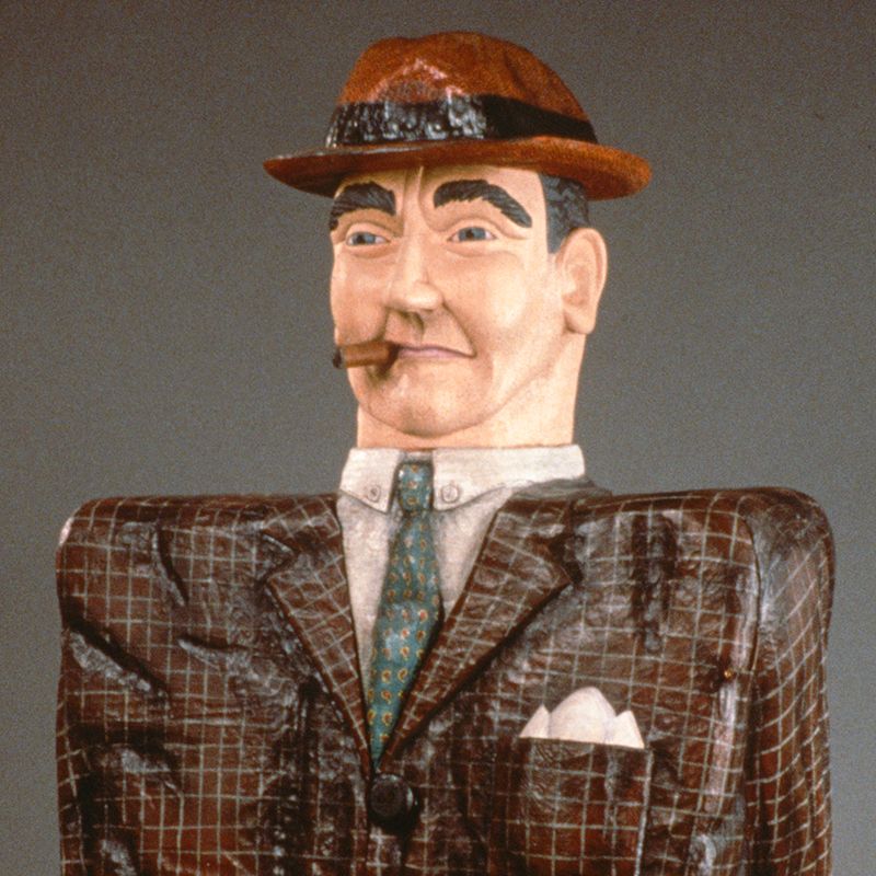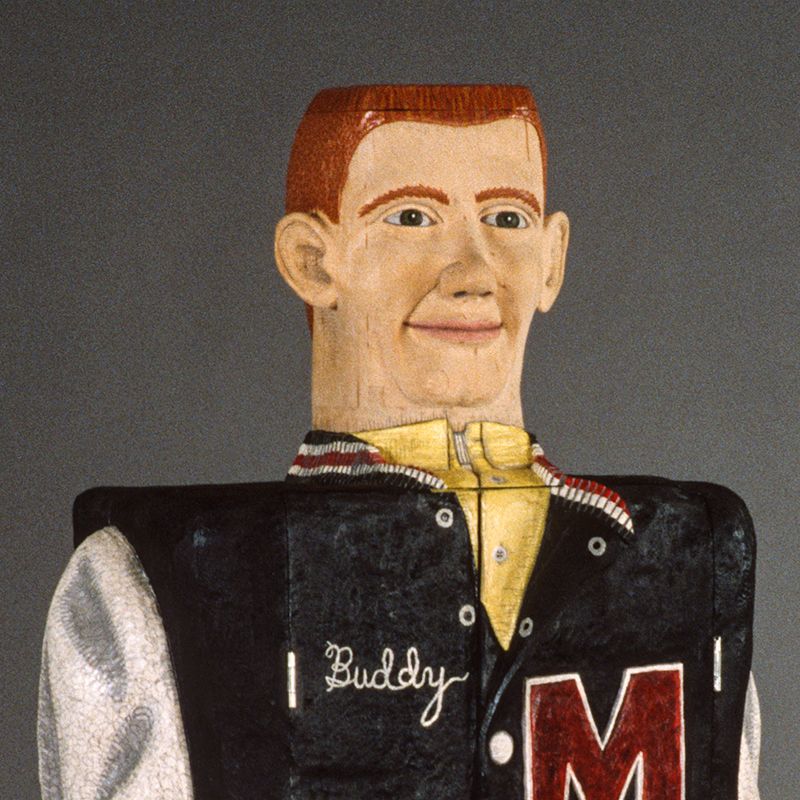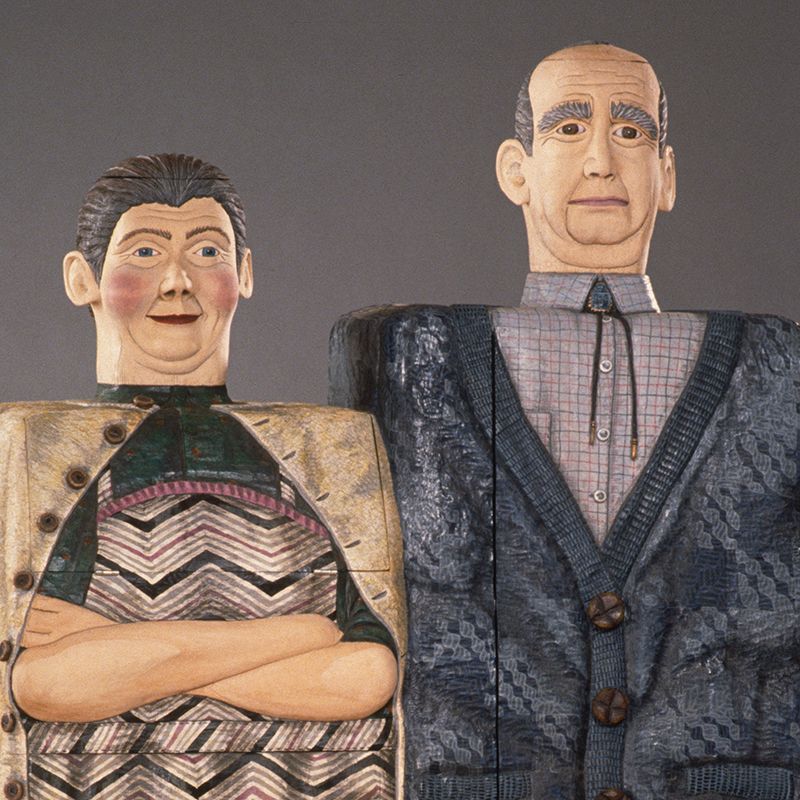 Each figure represents a stereotype from my youth – businessman, waitress, housewife and baby, teenager, grandparents, boy, and girl. The series involves a fictitious social studies assignment given in second grade:  Mrs. Gardner told us to interview people in our community, take their picture, and then make a booklet.